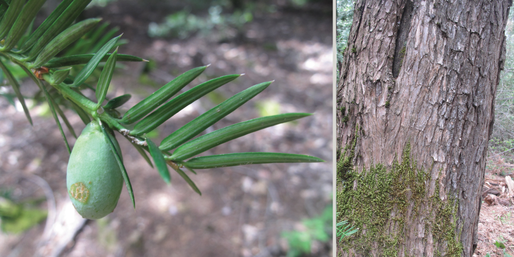 Like the Pacific yew, California nutmeg is a member of the Taxaceae family and it occupies similar coastal forests and Sierra foothill habitats. When young or growing in shade, its flat, narrow needles can suggest redwood foliage to the untrained eye.