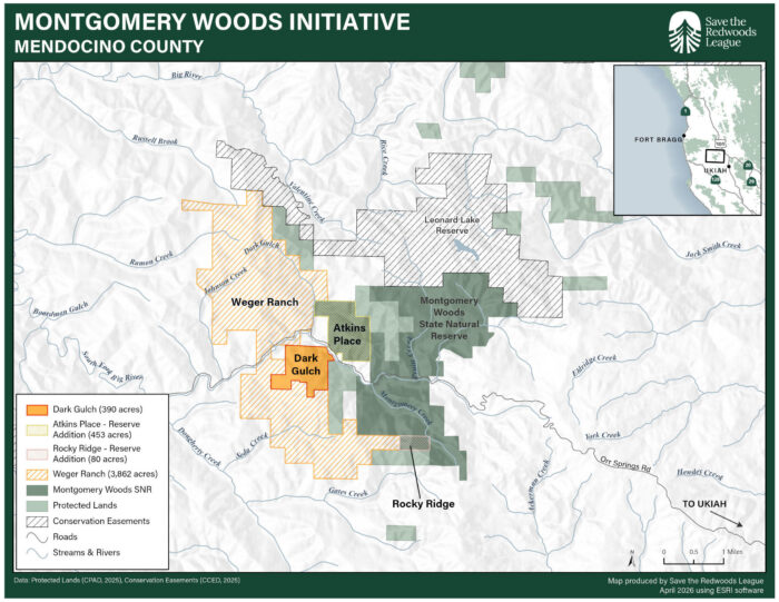 Adding these 453 acres to Montgomery Woods State Natural Reserve boosts the park’s size by an impressive 16%.